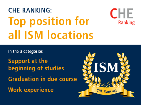 Die ISM hat von ihren Studierenden erneut hervorragende Noten im CHE-Ranking erhalten. In den wichtigsten Kategorien gehört die ISM zu Spitzengruppen: Beratung und Unterstützung am Studienanfang, Abschlüsse in angemessener Zeit, Berufspraxis. Die ISM zeigt damit, dass es gelungen ist, die hohen Standards an allen sieben Standorten in Deutschland auszubauen.
