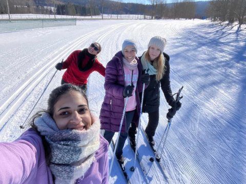 Letzten Herbst waren an der Konferenz im ägyptischen Safagaa ISM-Studierende mit eigenen Forschungsbeiträgen vertreten. Im Rahmen der Winter School erhielten im Gegenzug nun auch ägyptische Tourismusexpertinnen und Studierende die Gelegenheit, das Sporttourismusangebot in Deutschland kritisch unter die Lupe zu nehmen. Die ägyptischen Gäste testeten mit ISM-Prof. Dr. Hodeck und seinem Team unterschiedliche Sportangebote in Deutschland aus, um Rückschlüsse für eine nachhaltige Entwicklung des Sporttourismusangebots in beiden Ländern zu ziehen. Neben einer Führung am ISM Campus in Berlin standen auch ein Abstecher zum Tennisverband in Leipzig, das Ausprobieren von Wintersportangeboten und Einblicke ins Eibenstocker Vereins- und Kulturleben auf dem Programm. Wie wichtig dabei das persönliche Erleben der Natur und der Erhalt derselben ist, zeigte nicht zuletzt die begeisterten Reaktionen der ägyptischen Besucherinnen in Eibenstock. Denn es war das erste Mal, dass die Ägypterinnen echten Schnee sehen und anfassen sowie Wintersportaktivitäten ausprobieren konnten, so auch für Studentin Mai Gamal: „Obwohl ich durch mein Sportstudium schon viele verschiedene Sportarten ausprobiert habe, war ich noch nie Ski- oder Schlitten gefahren. Beides hat wahnsinnig viel Spaß gemacht und ich werde auf jeden Fall wiederkommen, um Wintersport zu machen." Das motivierte zusätzlich, sich neu Gedanken zu machen, wie angesichts extremer Klimaveränderungen Strukturwandel im Sporttourimus aussehen könnte.
